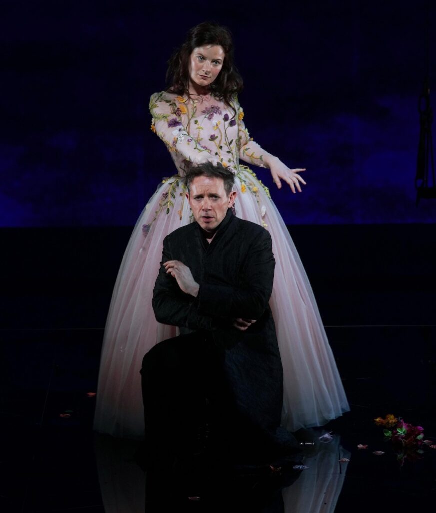 Dos parejas principales, que abren y cierran la ópera, formadas por los reyes del inmarcesible mundo de las hadas, Oberon y Tytania y por el duque de Atenas, Theseus y su inminente esposa, la reina de las amazonas, Hippolyta, dan sentido a toda la trama. Los primeros por presencia y acción y los segundos por ausencia y como objetivo. Oberon, encaprichado del duende Puck, servidor de su mujer, hace una de esas cosas que los poderosos, a fin de cuentas es rey, realizan de vez en cuando: subvertir los sentimientos y la moral mediante el engaño de una pócima, en esta ocasión, el jugo de una planta vertido en los ojos de la propicia víctima. En definitiva, el engaño y la mentira para conseguir su capricho, aunque al final el arrepentimiento y la reconciliación se impone y reina la concordia. Es el contratenor Iestyn Davies, al que ya escuchamos en estas mismas tablas como Arsace en la interpretación de Partenope, HWV 27 de Georg Friedrich Händel (1685-1759) en la temporada 2021-2022, y que como entonces conoce el papel que interpreta, siendo en esta ocasión de más alto calado y mayor riesgo, salvándolo con comodidad a pesar de los graves de su registro. Puck, el duende capricho del rey Oberon, está a cargo del actor Daniel Abelson y del bailarín argentino Juan Leiba. Siempre es delicado presentar una dualidad en escena con el riesgo de distraer o dispersar la atención del espectador, pero la labor de Warner consigue un resultado grato escénicamente que, tanto actor como bailarín, firman con solvencia. La engañada reina feérica, Tytania, está a cargo de la soprano Liv Redpath en la que destaca su brillantez generalizada y la facilidad en las coloraturas.