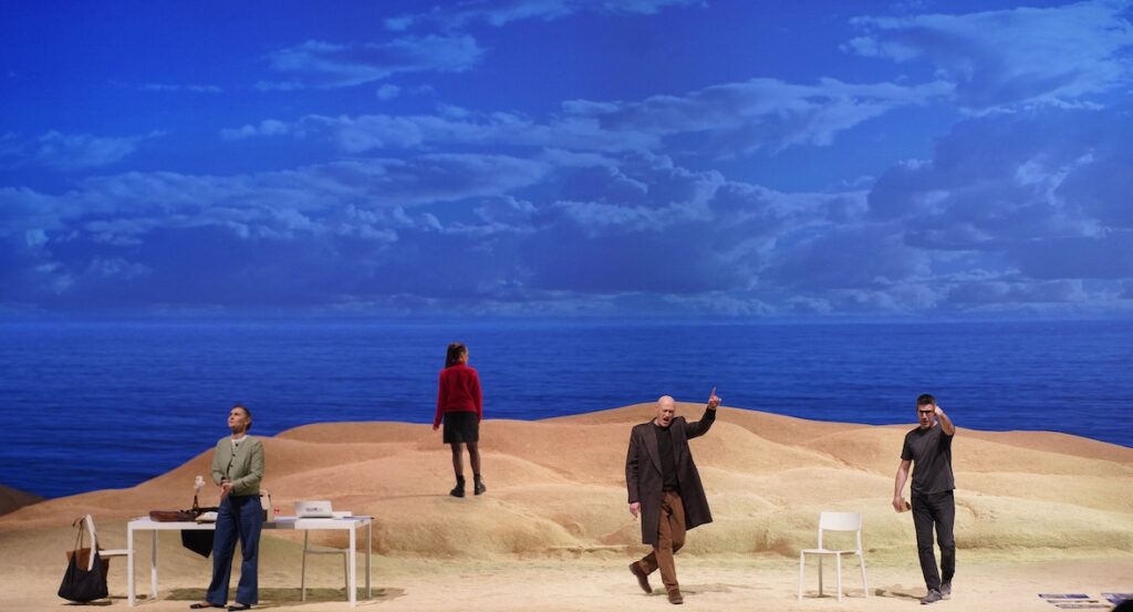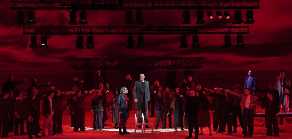 Encargo realizado al compositor y como libretista el dramaturgo Àlex Rigola, también director de escena. Como libretista ha conservado el tronco dramático del original, siendo una útil herramienta para la puesta en música, a pesar de cierta disociación momentánea en algún pasaje. Como director de escena pide a los cantantes unas exigencias quizás más relajadas que las que plantea la propia música, que es, en definitiva, la que pone límites. La escenografía consiste en unas especie de dunas fijas, suspendidas, con un cielo y luz que va desde el mundo del René Magritte onírico al asfixiante y torturado de Edvard Munch, que gracias a la iluminación de Carlos Marquerie consigue dinamizar el marco algo insípido propuesto. Donde todos los escenarios confluyen en las presuntas dunas, sin que nunca sean dunas.